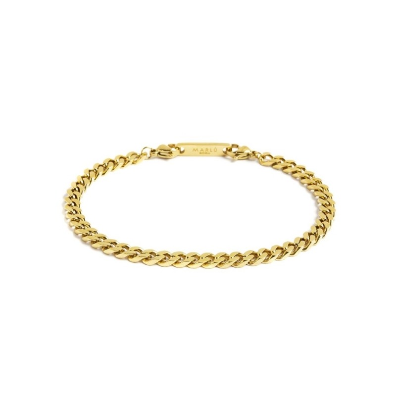 Bracciale con catena grumetta di 4.40 mm, regolabile tramite Marlù logo tag removibile. La chiusura doppia è con una texture a righe e logo Marlù incisi.