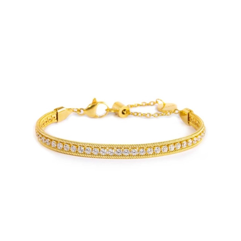 Bracciale in acciaio a triplo filo con catena tennis nella parte centrale con cubic zirconia di diametro 2,50 e con catena snake squadrata sui lati. Lunghezza totale 19 cm regolabile tramite cursore da 19 cm a 15 cm. Chiusura con moschettone. Marlù logo tag presente all' estremità.