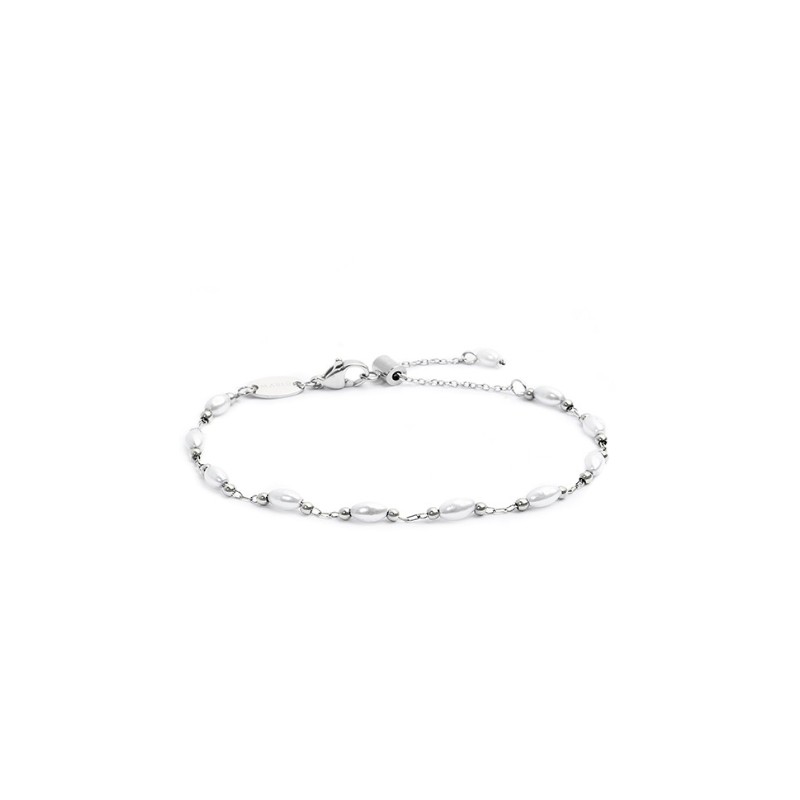 Bracciale in acciaio con catena con perle irregolari bianche rivestite e sfere in acciaio. Tag ovale con il logo Marlù ad una estremità vicino al moschettone. All'altra estremità una perla ovale bianca rivestita. Lunghezza totale 19 cm regolabile tramite cursore da 19 a 15 cm. Disponibile in acciaio e acciaio con pvd oro.