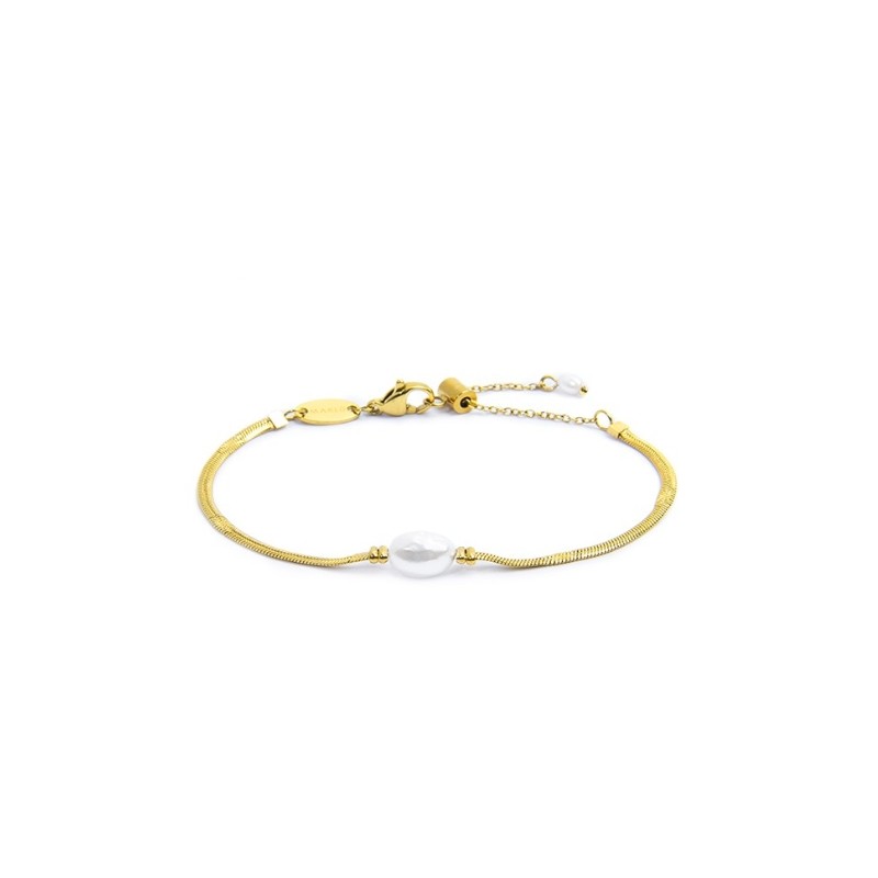BRACCIALE MARLU' IN ACCIAIO DORATO CON CATENA FIGARO CON TRAMA CON CATENE E PERLE BIANCHE IRREGOLARI RIVESTITE