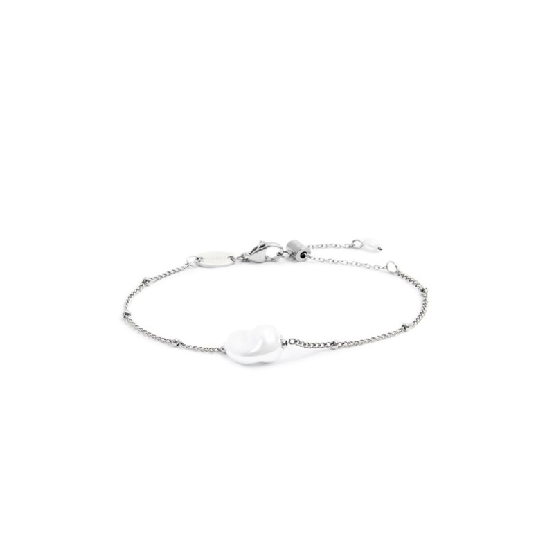 Bracciale in acciaio con catena grumetta con sfere, al centro perla irregolare bianca rivestita. Tag ovale con il logo Marlù ad una estremità vicino al moschettone. All'altra estremità una perla ovale bianca rivestita. Lunghezza totale 19 cm regolabile tramite cursore da 19 a 15 cm. Disponibile in acciaio
