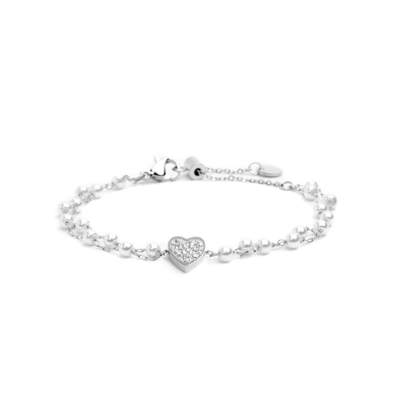 Bracciale in acciaio con doppia catena con perle rivestite. Al centro un cuore in acciaio, sul cui fronte si trovano cristalli bianchi, sul retro raggi incisi che formano un cuore. Lunghezza totale 19 cm regolabile tramite cursore da 19 cm a 15 cm.