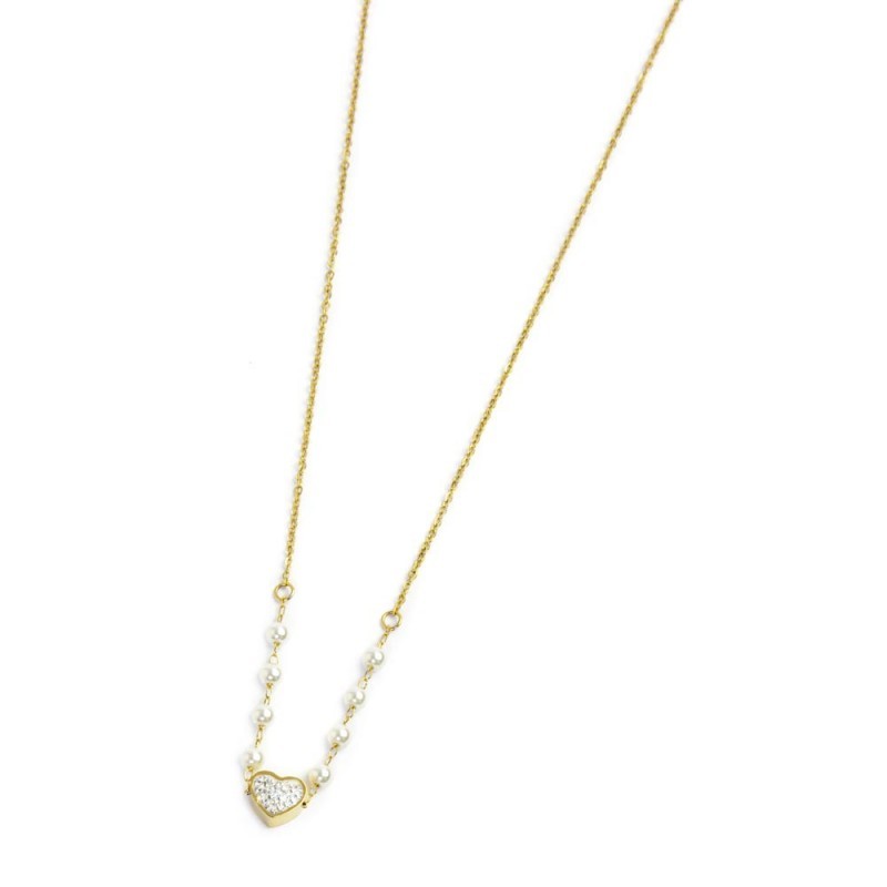 Collana in acciaio con pvd oro con catena cross e con catena con perle. Al centro un cuore in acciaio, sul cui fronte si trovano cristalli bianchi, sul retro raggi incisi che formano un cuore. Lunghezza totale 50 cm regolabile tramite cursore. Marlù