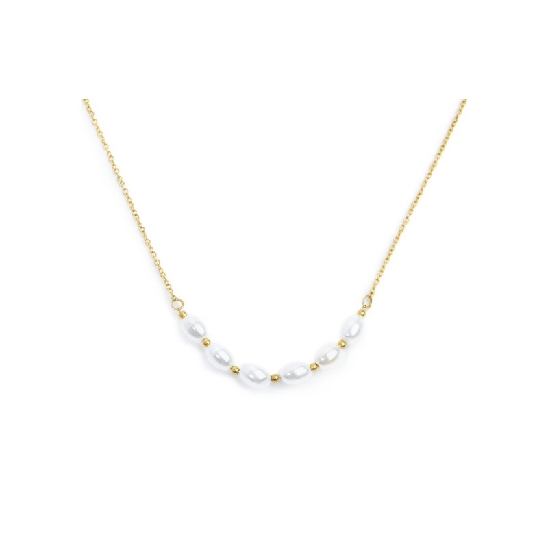COLLANA ACCIAIO DORATO CON CATENA CROSS AL CENTRO PERLE OVALI BIANCHE RIVESTITE ALTERNATE AD ELEMENTI DI ACCIAIO
