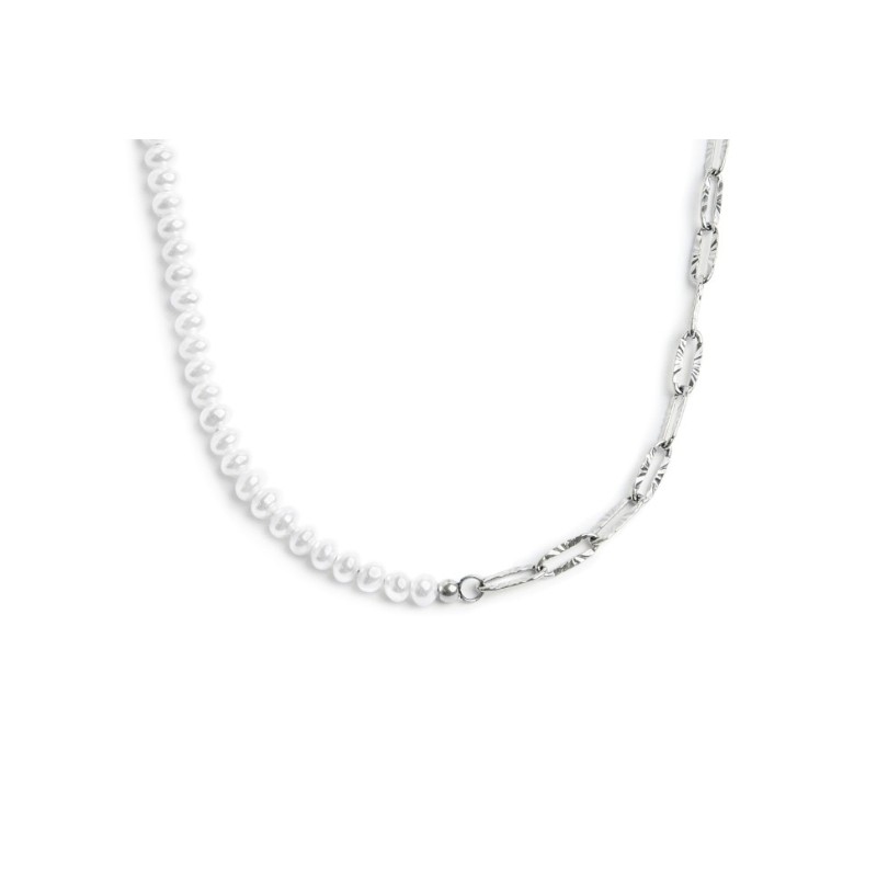 COLLANA IN ACCIAIO CON FIGARO CON TRAMA CON PERLE BIANCHE IRREGOLARI RIVESTITE