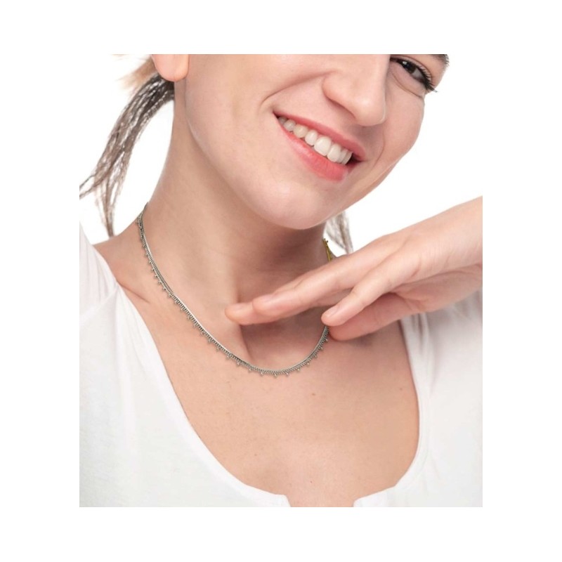 Collana con doppia catena: la prima è una catena snake quadrata con larghezza 1,10 mm. La seconda è una catena grumetta con sfere pendenti. Lunghezza totale 50 cm regolabile tramite cursore da 50 cm a 40 cm. Marlù logo tag presente all' estremità.