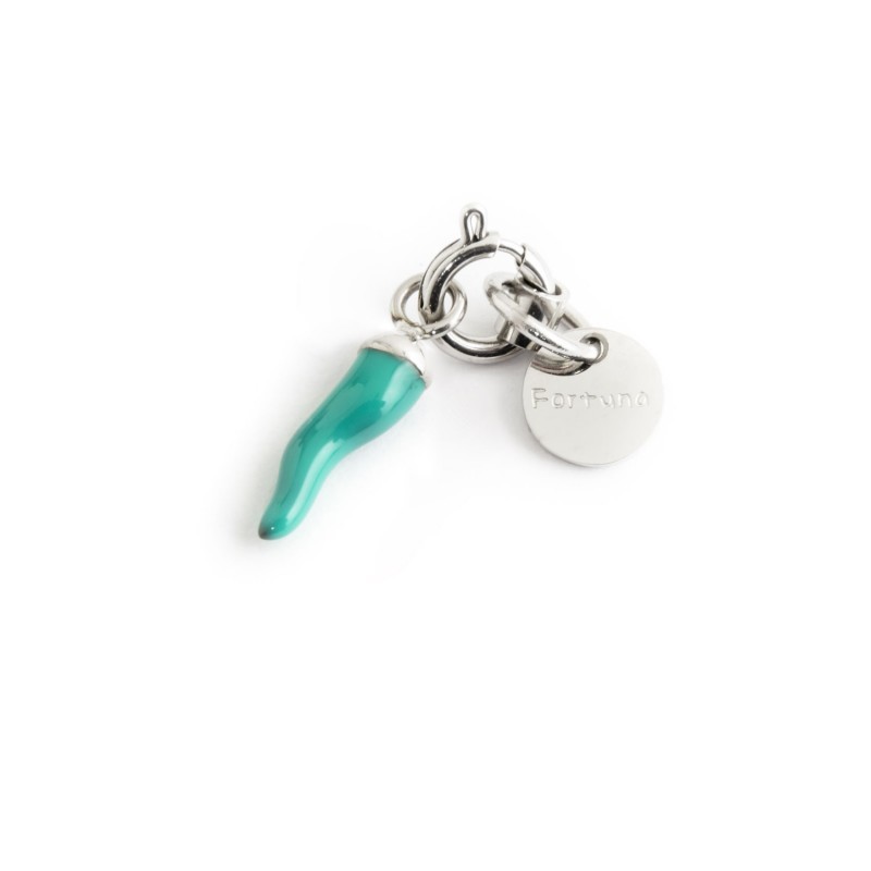 Charm a forma di corno portafortuna in acciaio, dimensione 1,3 cm. Colori: oro, rosè, rosso,turchese.