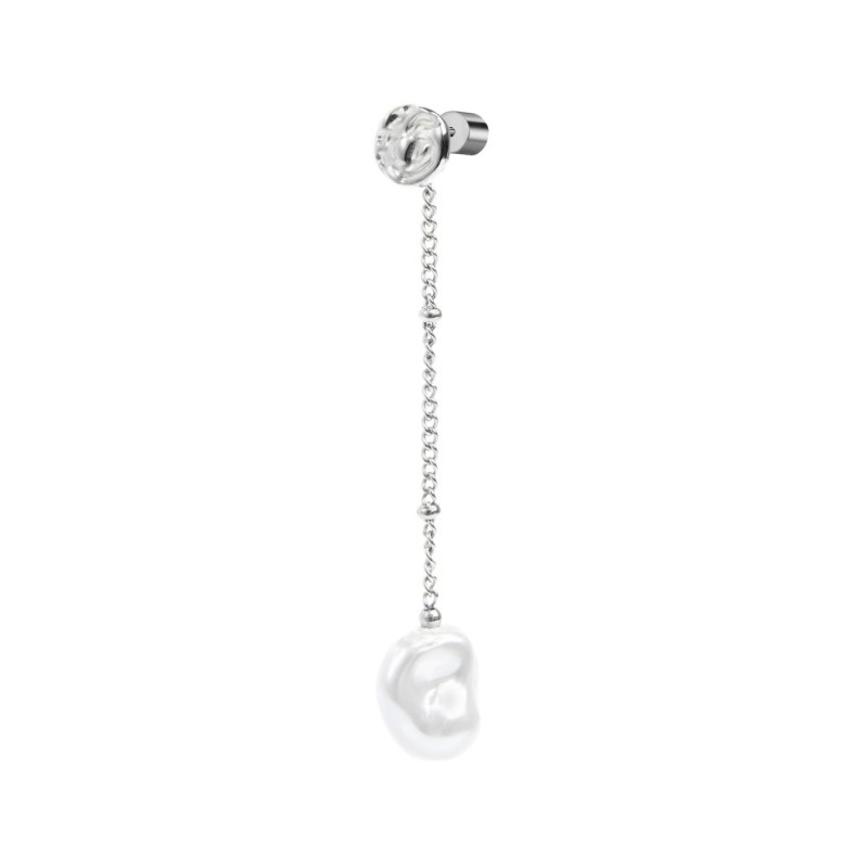 Mono orecchino in acciaio con orecchino a bottone martellato con pendente removibile composto da catena grumetta con sfere con perla bianca irregolare rivestita. Lunghezza totale 5,8 cm. Disponibile in acciaio e acciaio con pvd oro