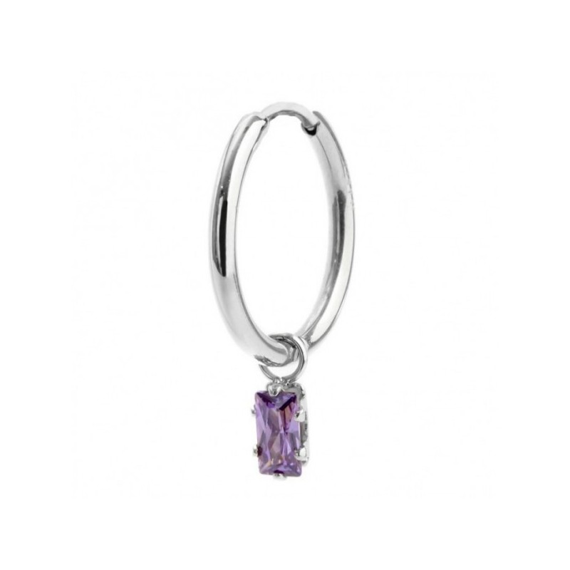 Mono orecchino in acciaio a cerchio con diametro 15,30 mm con chiusura a pressione, con cristallo baguette viola pendente. Logo Marlù laserato sul fianco. Materiali: acciaio, cristallo Collezione: BEW12