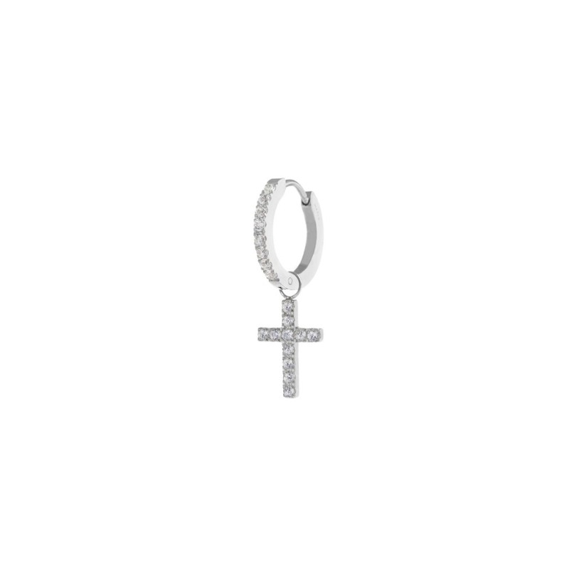 Mono orecchino in acciaio a cerchio con diametro 1,6 cm con cubic zirconia bianchi e pendente a forma di croce con cubic zirconia bianchi. Materiali: acciaio, cubic zirconia